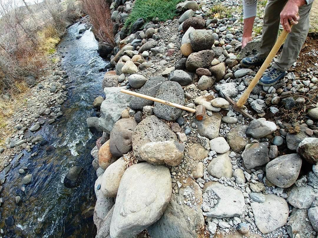 Enter an acquaintance with stonemason skills who embraced the project. The first order of business was to pulverize the existing concrete. Joe arrived one morning with safety goggles, a 9-pound sledge hammer, and an unerring knack for striking the concrete just so. Our goal was to reduce the unappealing slab to rough-hewn, fist-sized chunks. The shattered concrete was to be repurposed as ballast to fill a gap in the pathway, thus creating a solid base for our vision of improved stair-steps.
